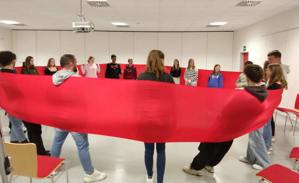 Dass persönliche Grenzen ganz individuell sind wurde deutlich, als Toma sich gemeinsam mit der ganzen Gruppe in ein großes Band stellte. Während manchen schon das Stehen dicht an dicht ausreichte, testeten andere Teilnehmer die Belastungsgrenze des Stoffes und ließen sich regelrecht fallen.