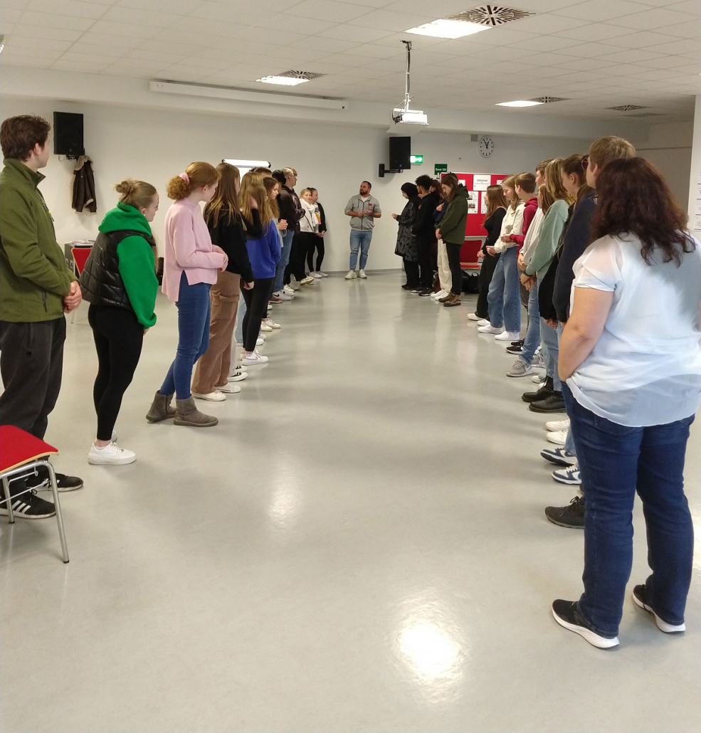 43 ausgebildete StreitschlichterInnen aus den Klassenstufen 10 – 12 befassten sich in einem ganztägigen Workshop intensiv mit ihrer ehrenamtlichen Rolle im Schulalltag. Aufgeteilt in zwei Gruppen, leitete Franlin Toma (Haltungs- und Mentaltrainer) dazu an, Konflikte in Hinblick auf die eigene Haltung neu zu bewerten